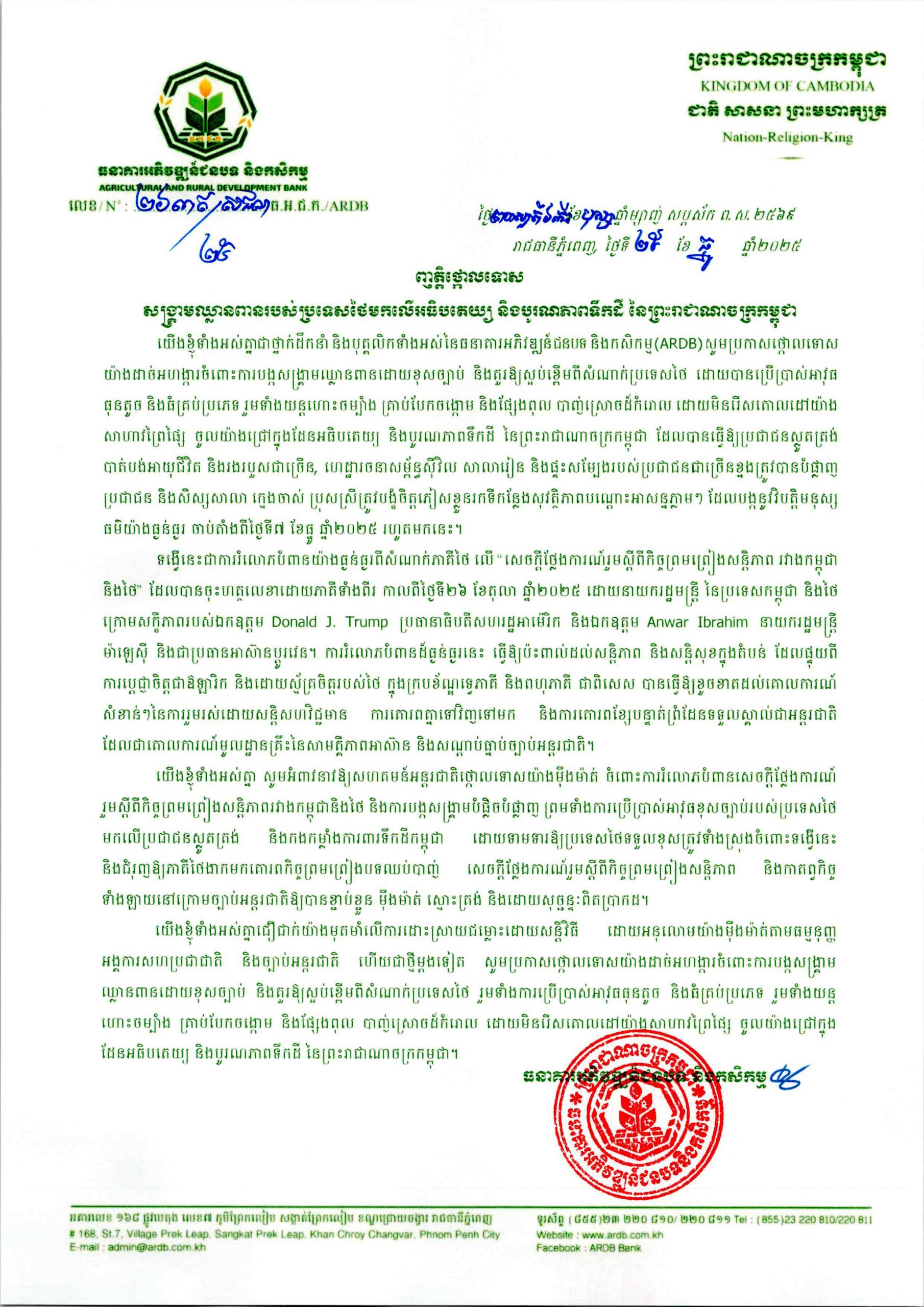 ភ្នំពេញ៖ ធនាគារអភិវឌ្ឍន៍ជនបទ និងកសិកម្ម (ARDB) នៅថ្ងៃទី២៥ ខែធ្នូ ឆ្នាំ២០២៥នេះ បានចេញញត្តិថ្កោលទោសសង្គ្រាមឈ្លានពានរបស់ប្រទេសថៃមកលើអធិបតេយ្យ និងបូរណភាពទឹកដី នៃព្រះរាជាណាចក្រកម្ពុជា ដែលបានប្រើប្រាស់អាវុធធុនតូច និងធំគ្រប់ប្រភេទ រួមទាំងយន្តហោះចម្បាំង គ្រាប់បែកចង្កោម និងផ្សែងពុល បាញ់ស្រោចដ៏កំរោល ដោយមិនរើសគោលដៅយ៉ាងសាហាវព្រៃផ្សៃ។