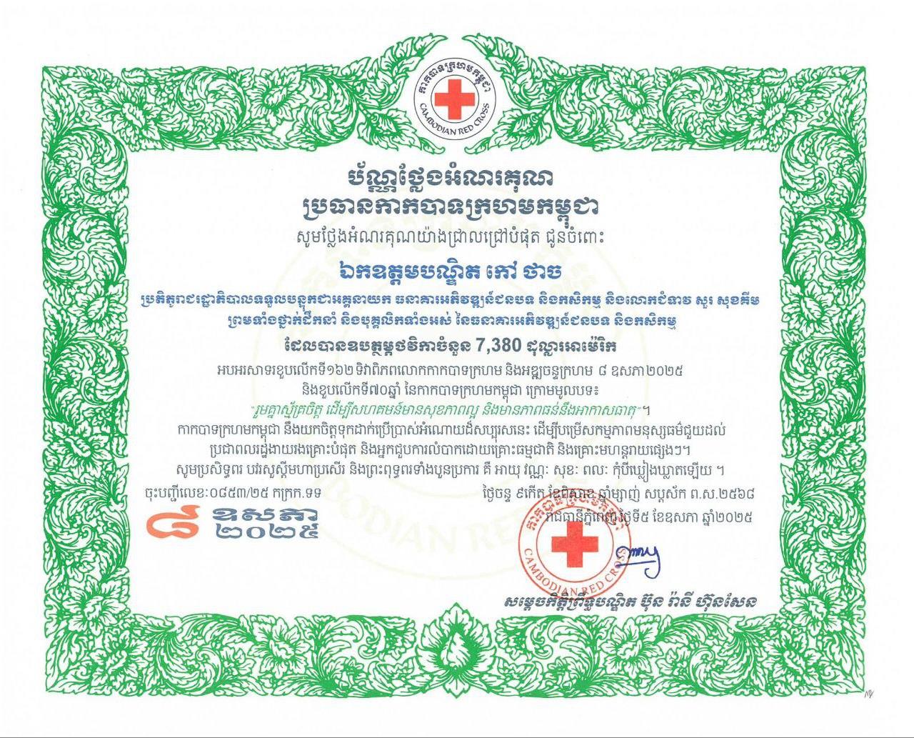 ជាមួយនឹងការបរិច្ចាគនេះ សម្តេចកិត្តិព្រឹទ្ធបណ្ឌិត ប៊ុន រ៉ានី ហ៊ុនសែន ប្រធានកាកបាទក្រហមកម្ពុជា តាមរយៈលិខិតថ្លែងអំណរគុណ បានថ្លែងអំណរគុណយ៉ាងជ្រាលជ្រៅបំផុតចំពោះ ឯកឧត្តមបណ្ឌិត កៅ ថាច និងលោកជំទាវ សួរ សុខគីម ព្រមទាំងថ្នាក់ដឹកនាំ និងបុគ្គលិកទាំងអស់នៃធនាគារអភិវឌ្ឍន៍ជនបទ និងកសិកម្ម ដែលបានឧបត្ថម្ភថវិកាចំនួន៧.៣៨០ដុល្លារអាម៉េរិក ជូនកាកបាទក្រហមកម្ពុជា ក្នុងឱកាសខួបទី១៦២ ទិវាពិភពលោកកាកបាទក្រហម និងអឌ្ឍចន្ទក្រហម ៨ ឧសភា ឆ្នាំ២០២៥ និងខួបលើកទី៧០ឆ្នាំ នៃកាកបាទក្រហមកម្ពុជា ក្រោមមូលបទ «រួមគ្នាស្ម័គ្រចិត្តដើម្បីសហគមន៍មានសុខភាពល្អ និងមានភាពធន់នឹងអាកាសធាតុ»៕
